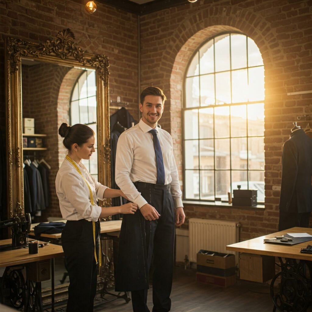 Using professional methods, we alter your clothing for natural movement and style. - Final Try-On & Finishing Touches